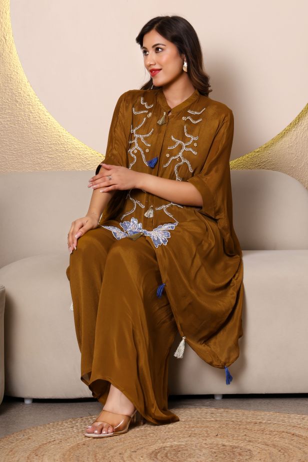 Celebrate the festive spirit with the Olive Bloom Kaftan Set, a statement piece from the Navrang Festive Collection.